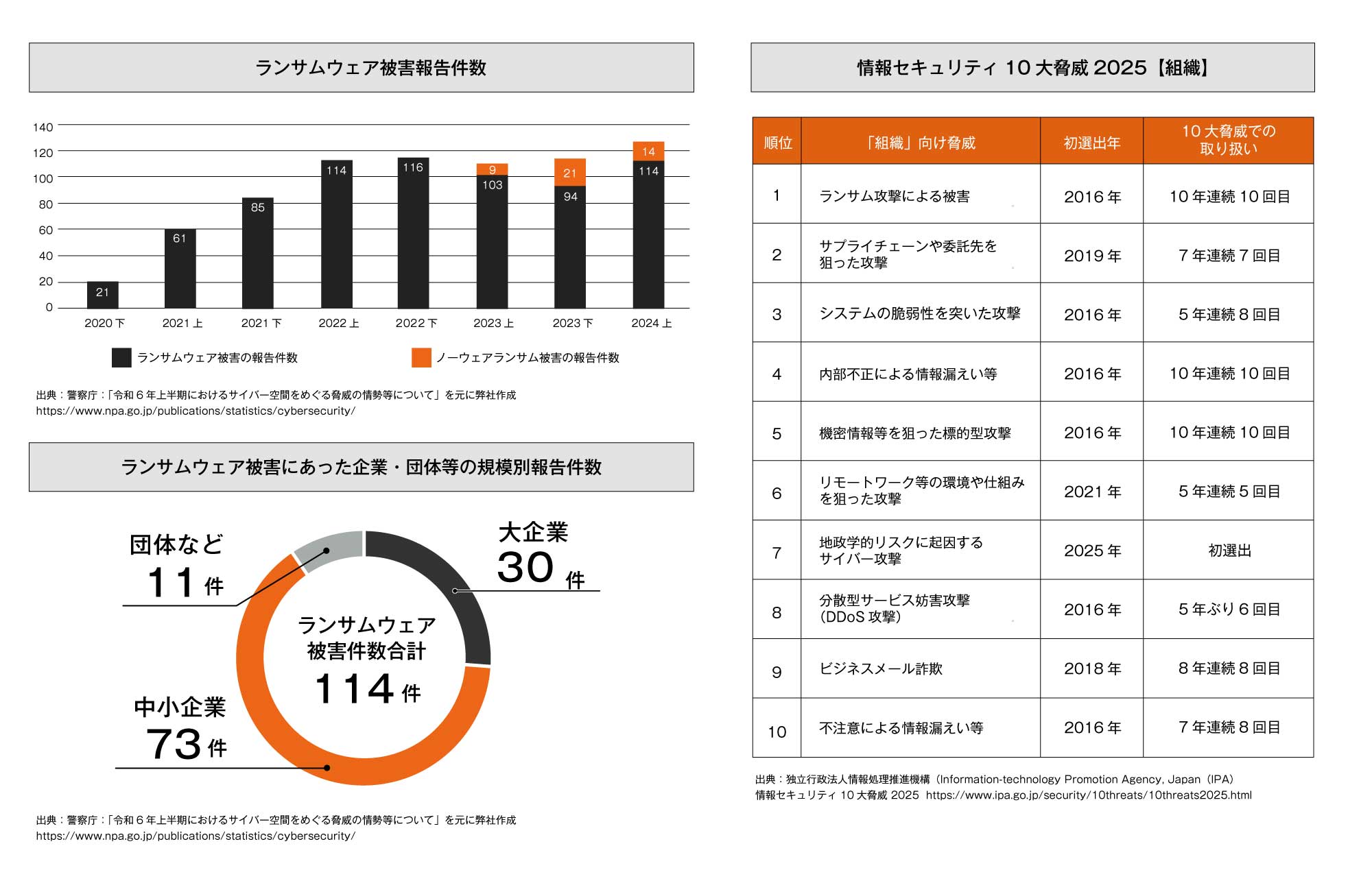 - 企業等の情報を暗号化して金銭をゆすり取る「ランサムウェア攻撃」や、国家支援型の攻撃集団等が特定の企業を執拗に狙う「標的型攻撃」が引き続き多く見られる。